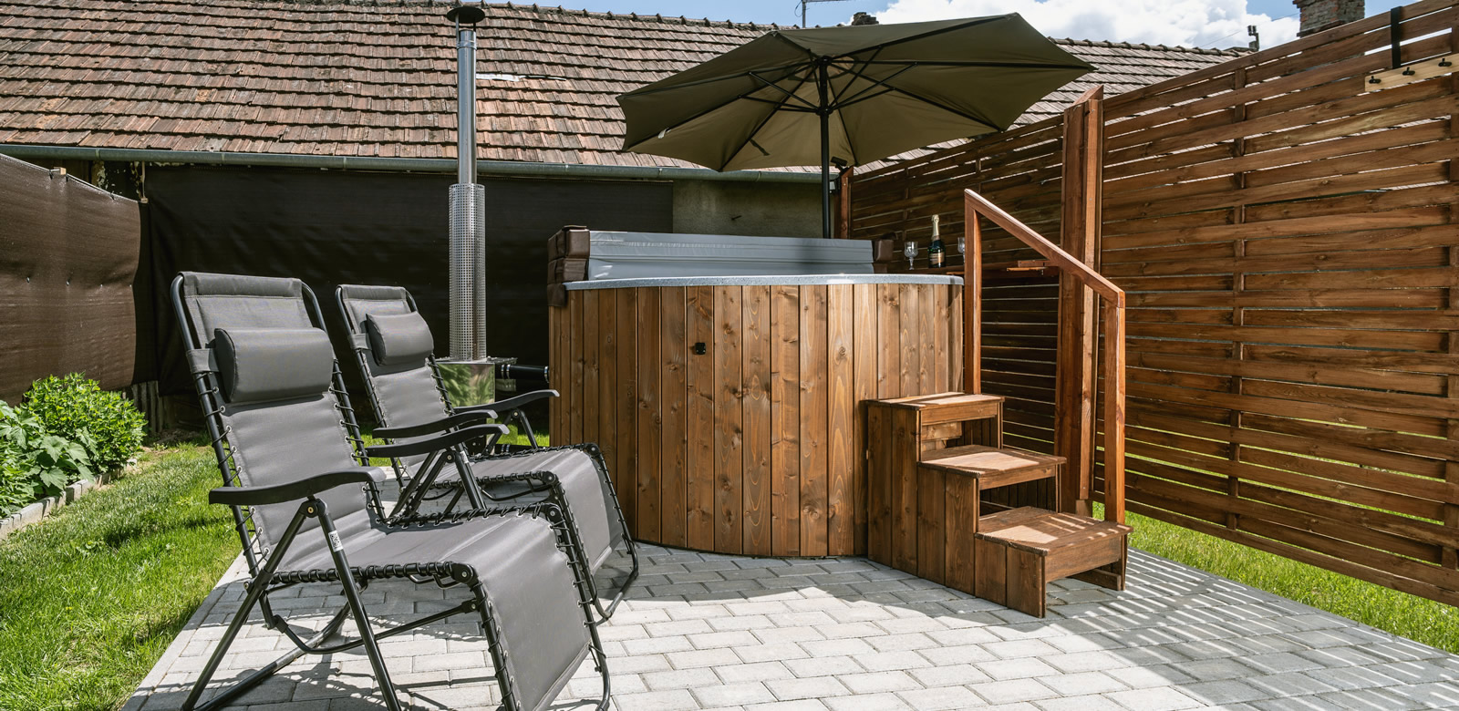 A kikapcsolódást és feltöltődést egy hat fő befogadására alkalmas dézsafürdő teszi még teljesebbé.